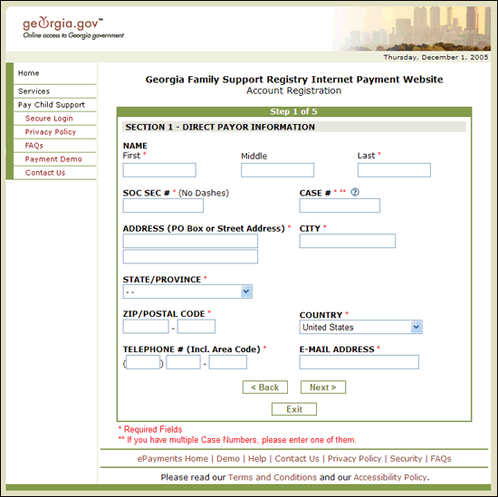 When registering for a new account, you will be asked for your Name, Social Security Number, NCP Case #, Address, Telephone Number, and E-Mail Address.